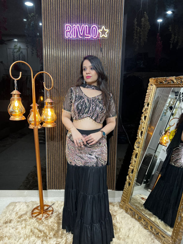 Turn heads in this dreamy Beige And Black ensemble that perfectly balances elegance and charm. The heavily hand-embroidered blouse features intricate sequin and bead detailing with a modern cut-out neckline and flutter sleeves. Paired with a flowy, tiered skirt that adds movement and grace to your look — this outfit is perfect for festive events, cocktail parties, and weddings.