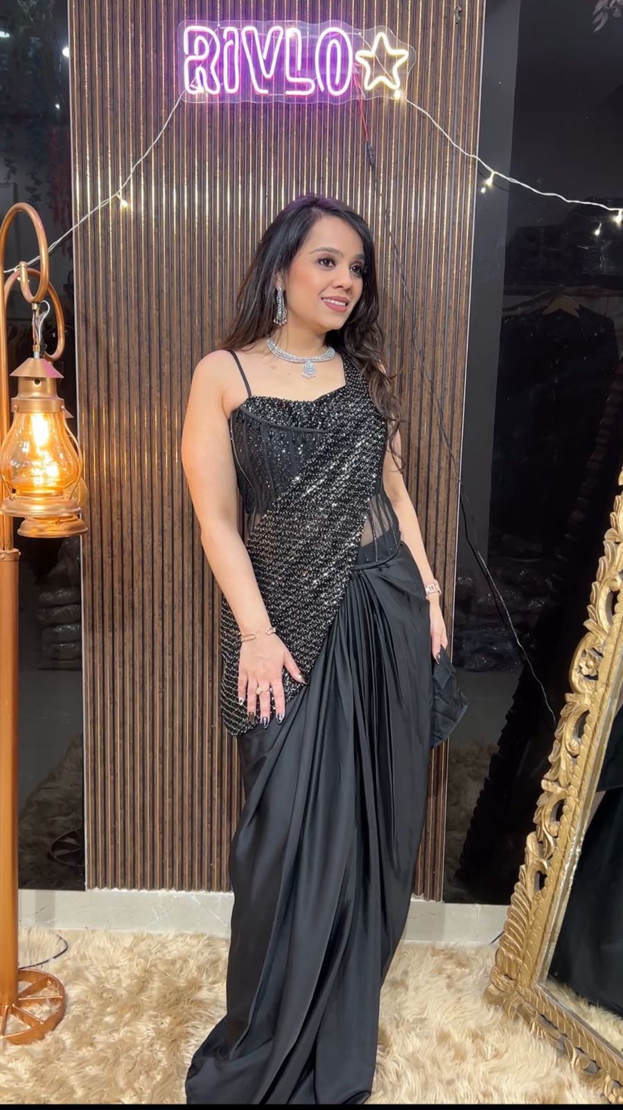 A contemporary masterpiece that fuses Indian grace with Western glam. This Indo-Western ensemble features a heavily embellished blouse with intricate crystal and sequin work, paired with a pre-draped ruffle skirt for effortless sophistication. The structured shoulder drape adds a statement edge, making it perfect for modern festivities and cocktail events.