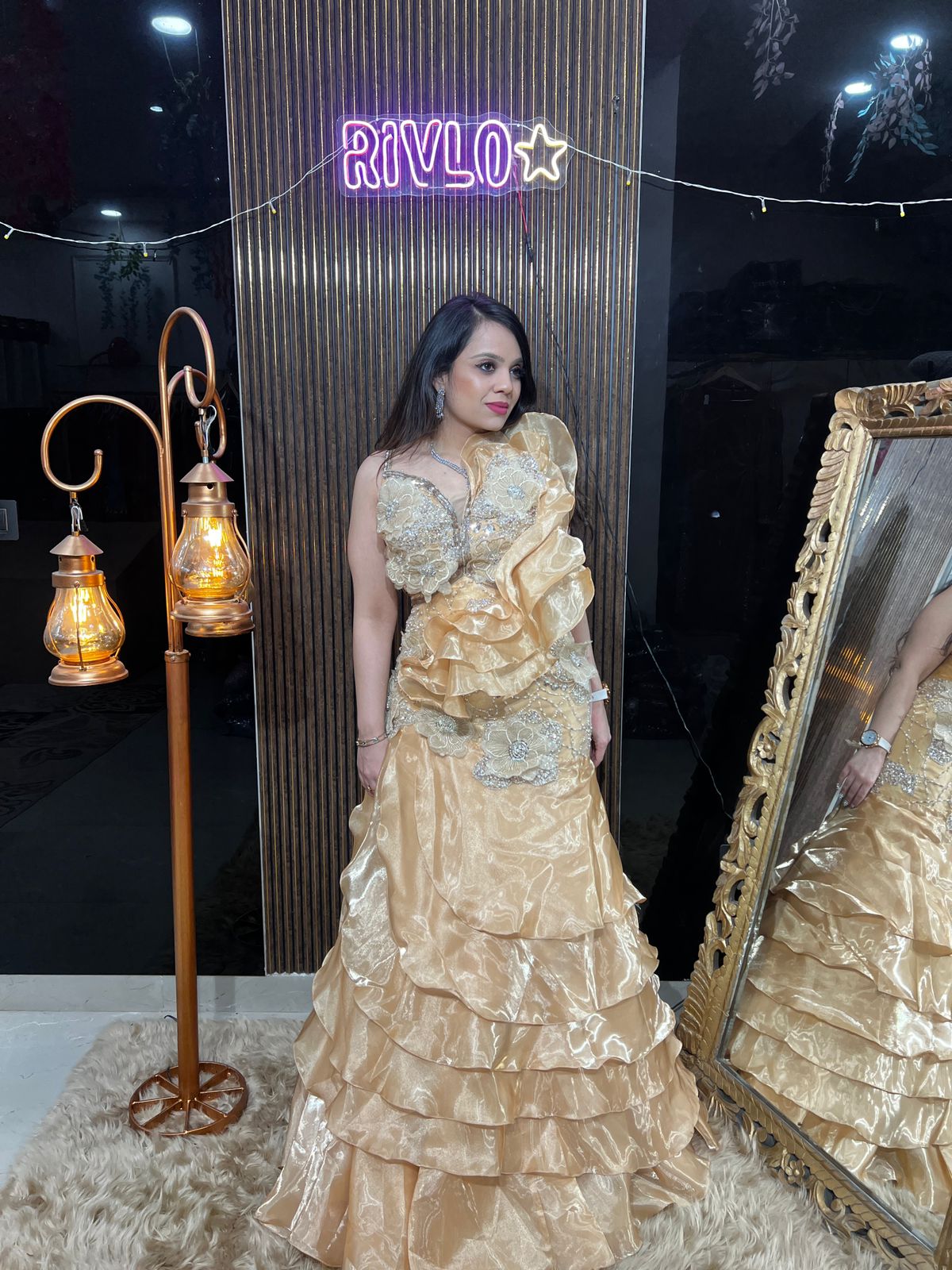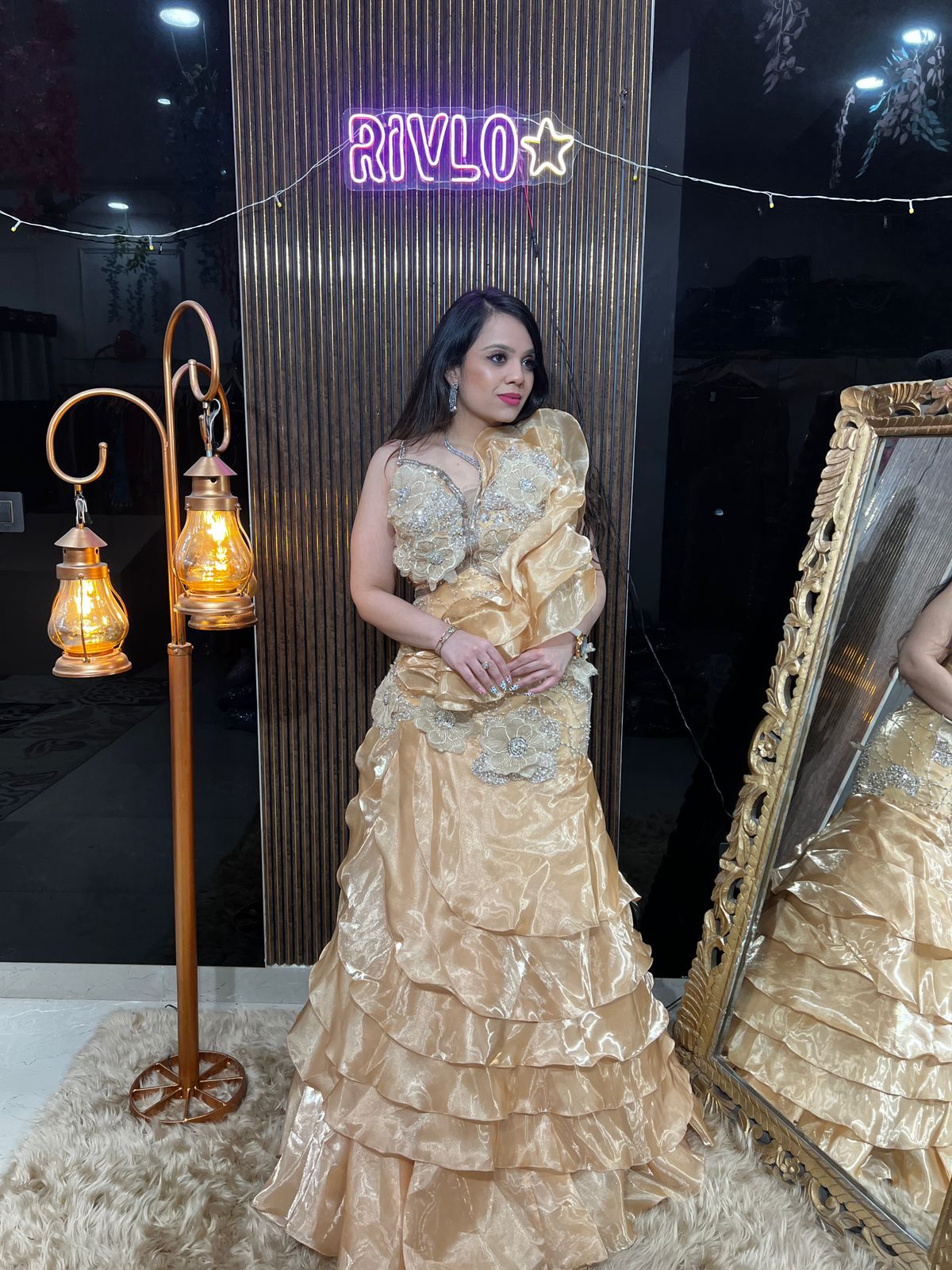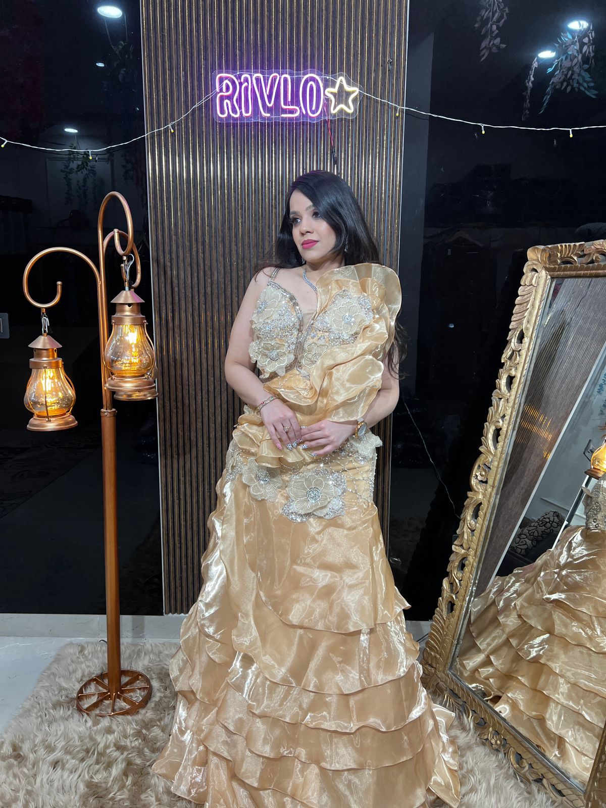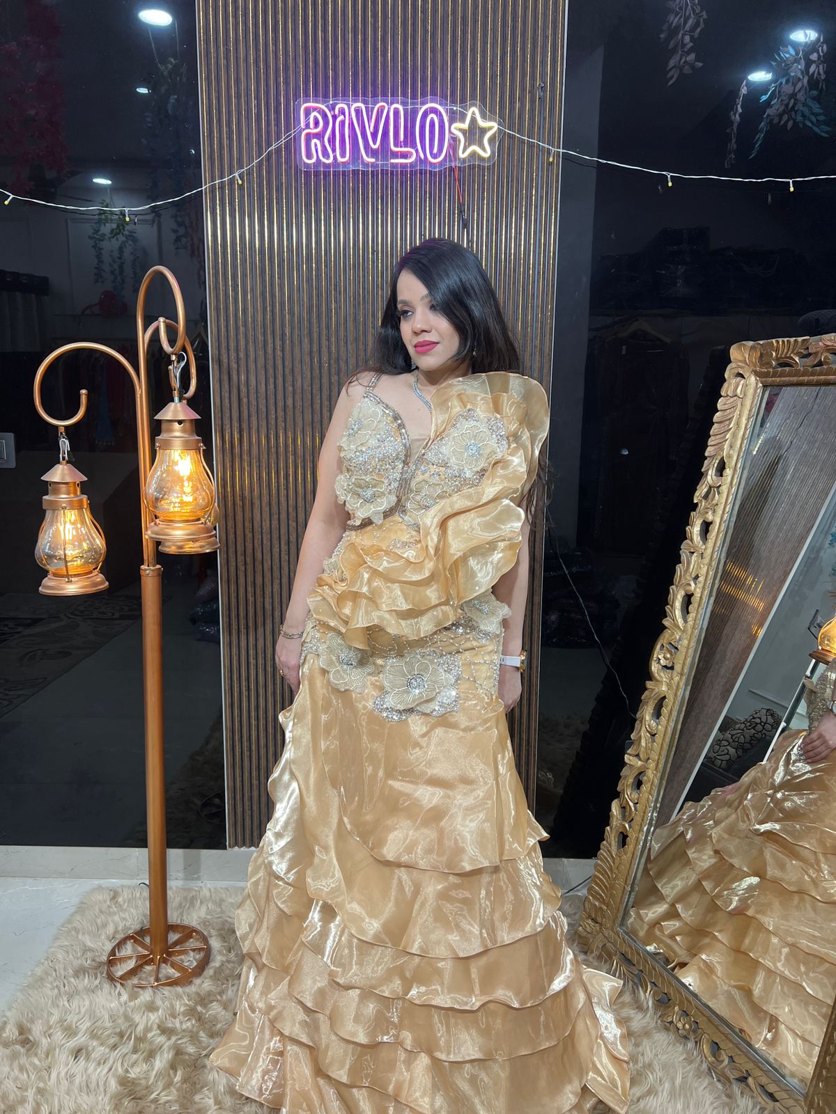 Step into pure luxury with this breathtaking ruffle trail gown, crafted in a high-shine fabric that flows elegantly with every movement. The gown features a sculpted 3D floral hand-embroidered bodice, enriched with beads, sequins and delicate shimmer detailing.