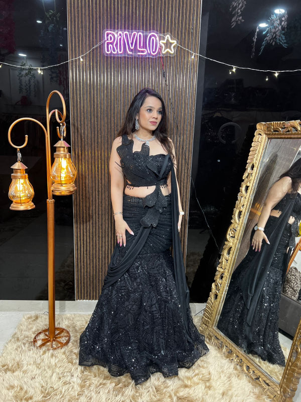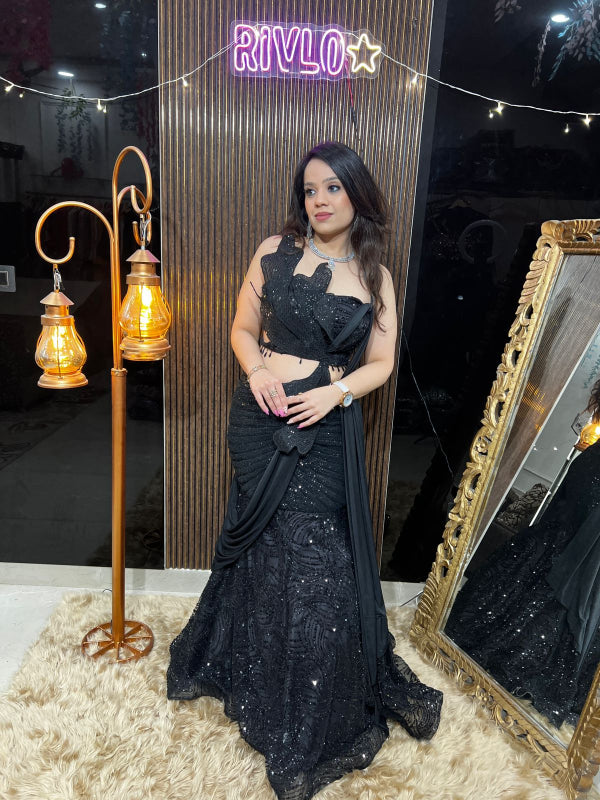 ✨ Scarlet Black Sequins Mermaid Drape Lehenga with Designer Cutwork Blouse RC428