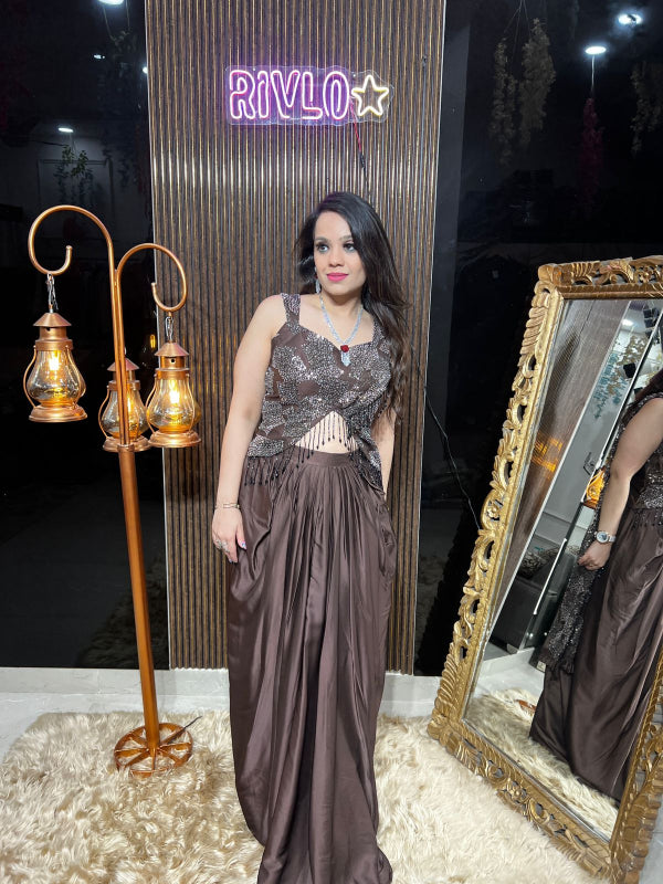 Featuring a chic sequined blouse with intricate detailing, paired with a stylish pre-draped skirt, this ensemble is the perfect blend of glamour and modern elegance. The flowy silhouette and shimmering accents make it an ideal pick for cocktail nights, receptions, and evening parties.