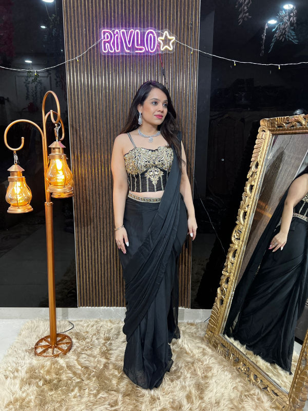 ✨Black Pre-Draped Saree with Embellished Blouse ✨✨ RC406