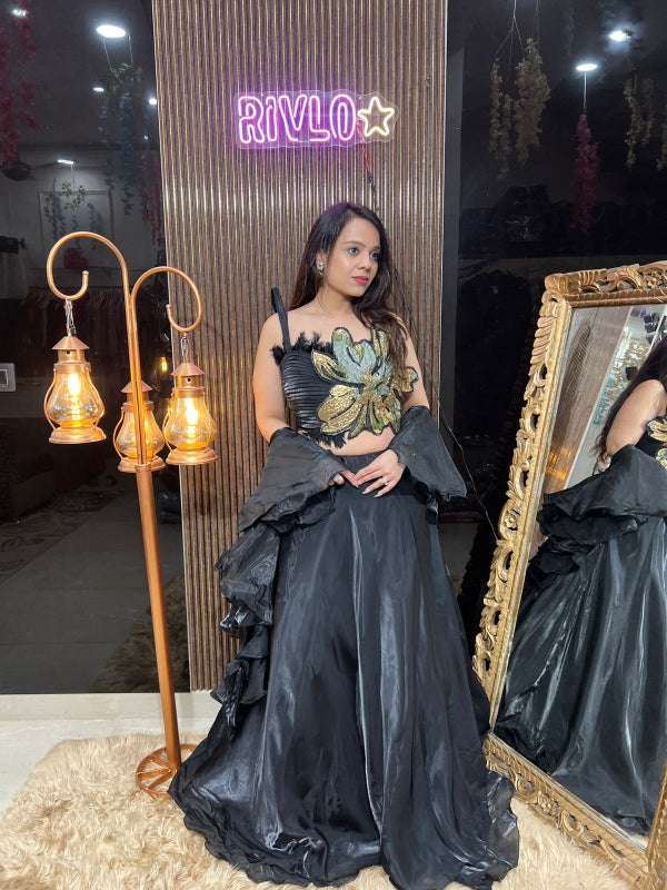 Step into elegance with this stunning black lehenga set, crafted to make you the center of attention. The blouse features bold sequin and thread embroidery with a striking floral motif, paired with delicate feather detailing for a touch of drama. The flowy black lehenga with layered ruffle accents adds volume and grace, creating a glamorous silhouette. Styled with a matching dupatta, this outfit is an ideal choice for weddings, receptions, cocktails, and festive occasions.