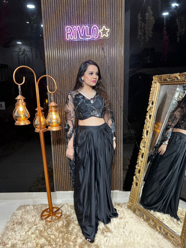This outfit features a beautifully embellished blouse with sheer embroidered sleeves, paired with a flowy pre-draped skirt for a modern yet graceful silhouette. The intricate detailing on the blouse adds a touch of luxury, while the sleek draped bottom ensures effortless elegance.