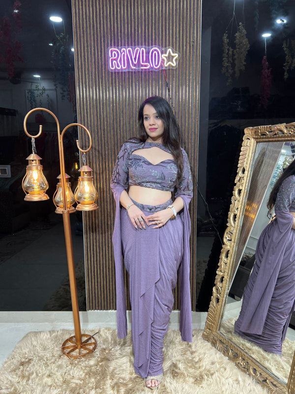 Radiate elegance with this pastel-hued drape saree set, designed for a sophisticated yet modern look. The outfit features a beautifully embroidered blouse with delicate thread and sequin work, paired with a pre-draped saree for effortless styling. The cape-style sleeves add a touch of contemporary charm, making this ensemble perfect for both day and evening celebrations.