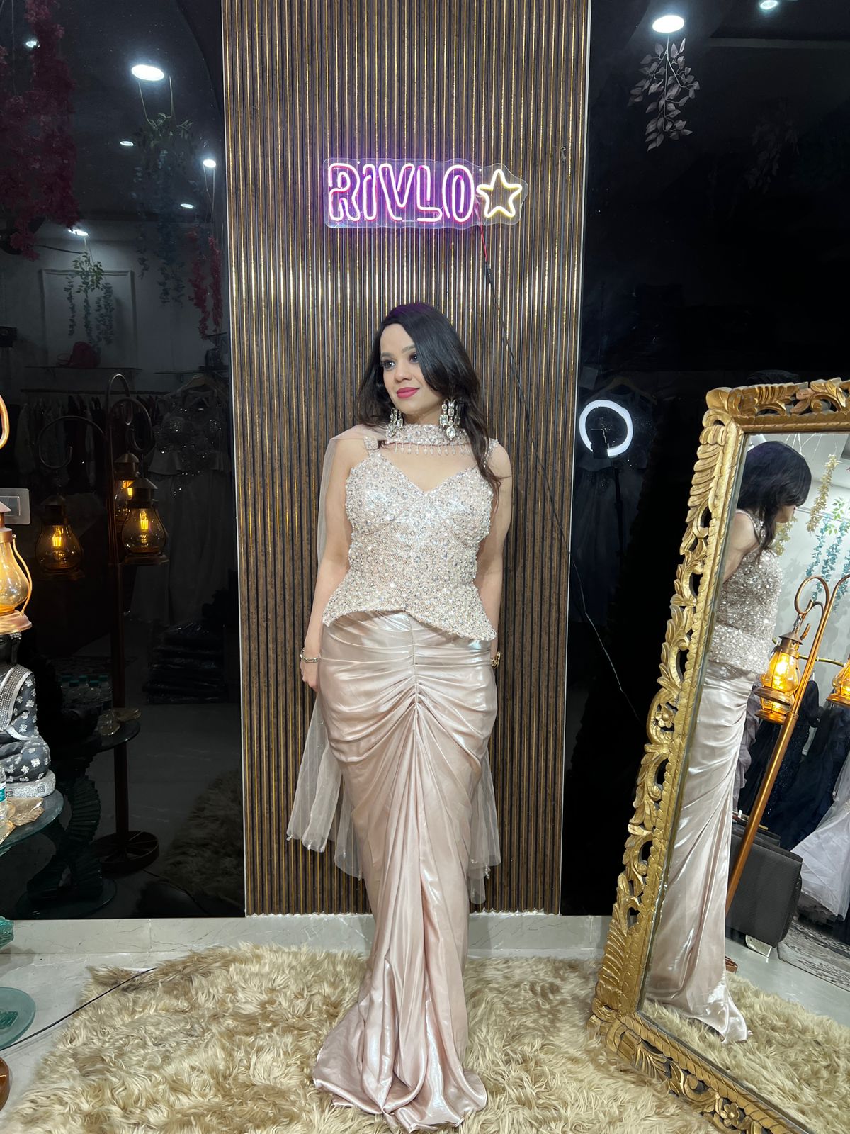 A striking fusion of modern glamour and timeless elegance, this ivory Indo-Western draped set is designed to make a statement. The look features a heavily crystal-embellished sleeveless top with a structured silhouette, paired with a luxe satin draped skirt that creates a fluid, sculpted fall.