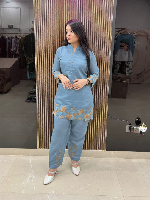 This Beautiful Embroidery Co-ord Set is expertly crafted with intricate embroidery, creating a stunning and unique design. Made from high-quality materials, it offers both comfort and style. Perfect for any occasion, this set is sure to make a statement and turn heads.