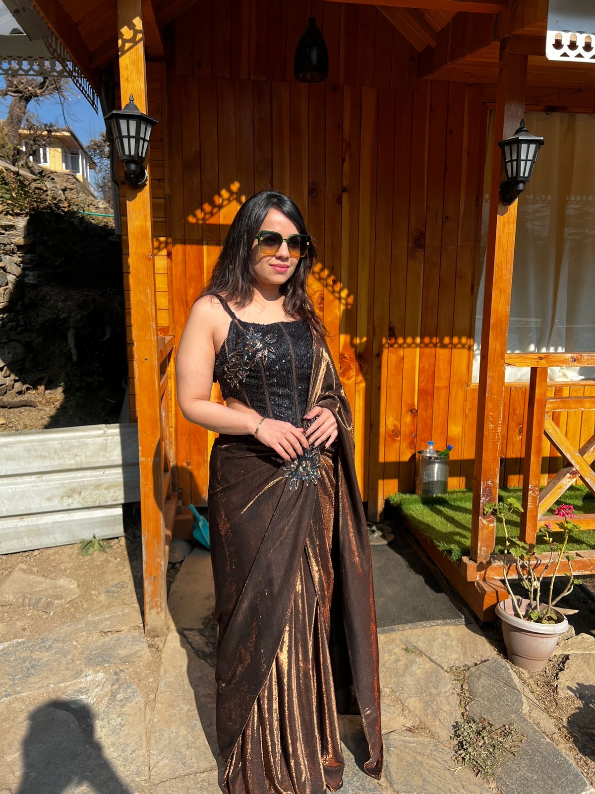 Bronze Metallic Pre-Draped Saree with Embellished Corset Blouse AC37