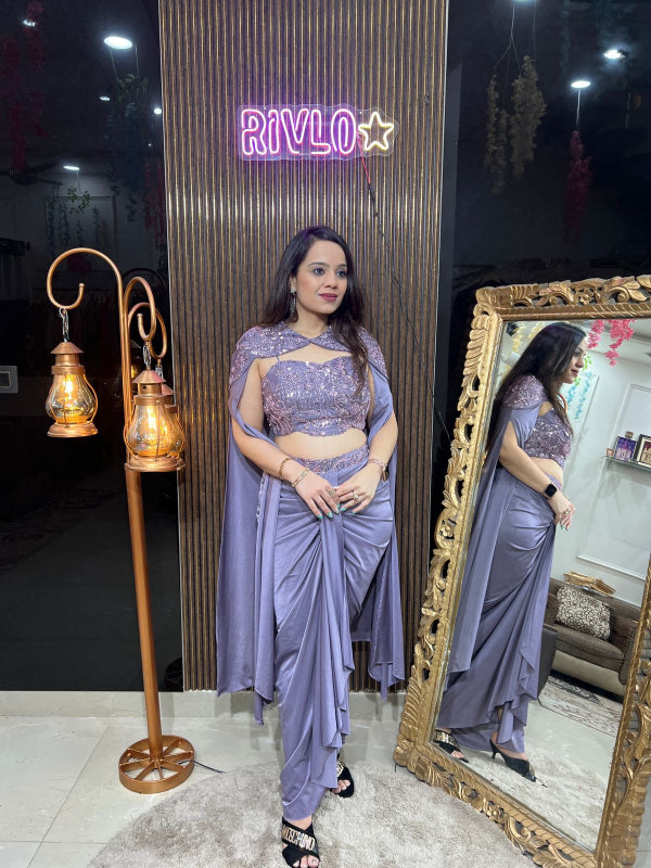 Step into elegance with this dreamy 3 Piece Indowestern Set. Designed for the modern diva, it features delicate net fabric with mirror and sequin embroidery on the blouse, paired with a flowy pre-draped skirt that flatters every curve. The sheer midriff panel adds a chic, contemporary touch while keeping it graceful. Perfect for daytime weddings, festive celebrations, or cocktail evenings.