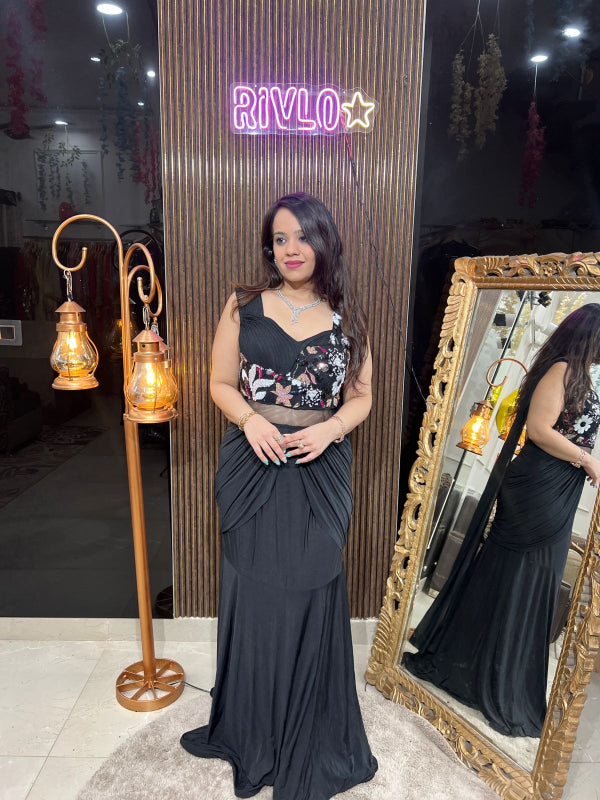 Embrace elegance with a contemporary twist in this draped gown. The sleeveless bodice is adorned with vibrant floral embroidery in multicolored threads and sequins, creating a fresh, eye-catching contrast against the deep blue base. Designed with soft draping at the hips and a graceful flared hemline, this gown hugs the body in all the right places while ensuring ease of movement. Perfect for evening parties, cocktail events, or wedding receptions where you want to make a sophisticated statement.