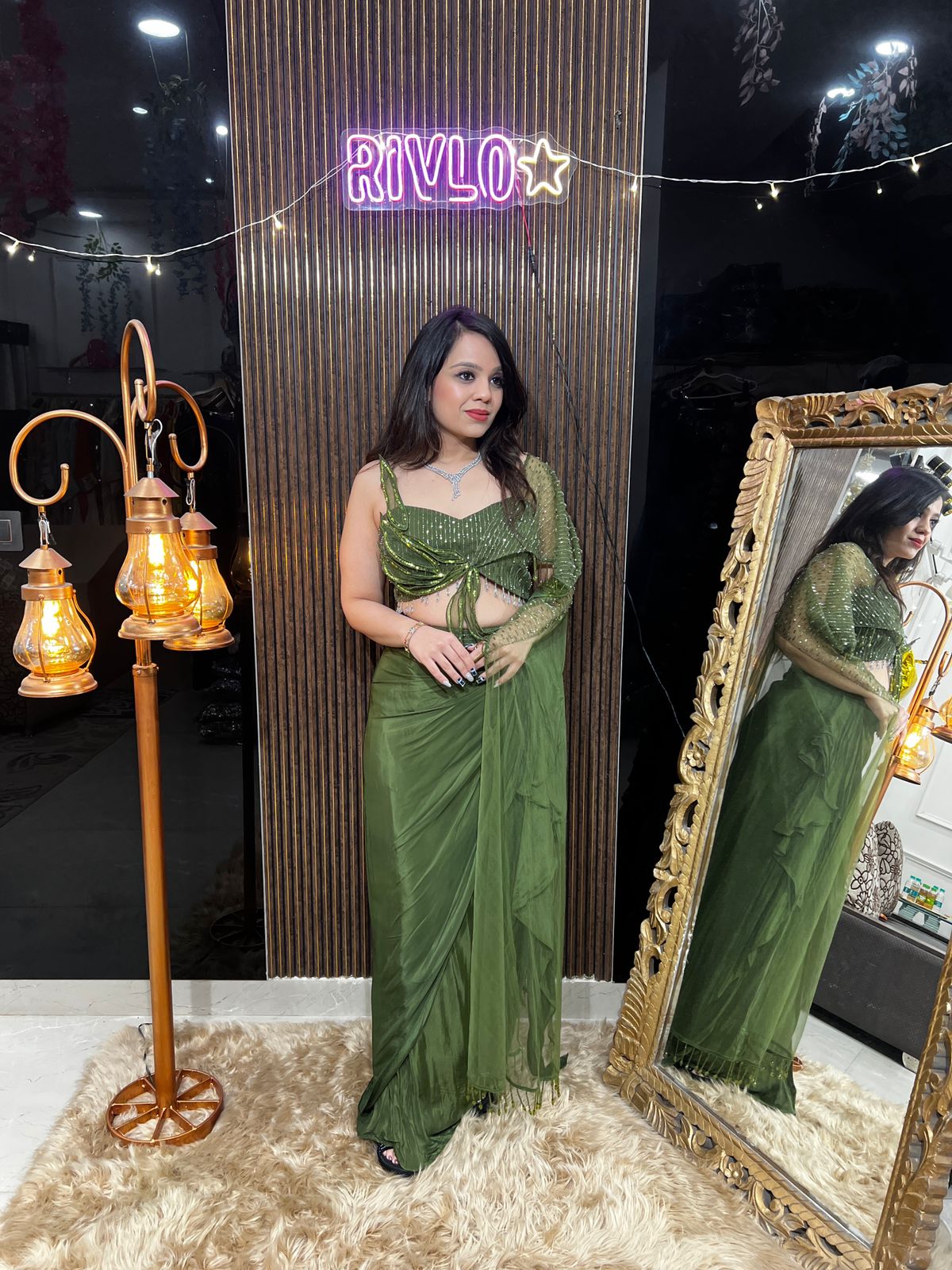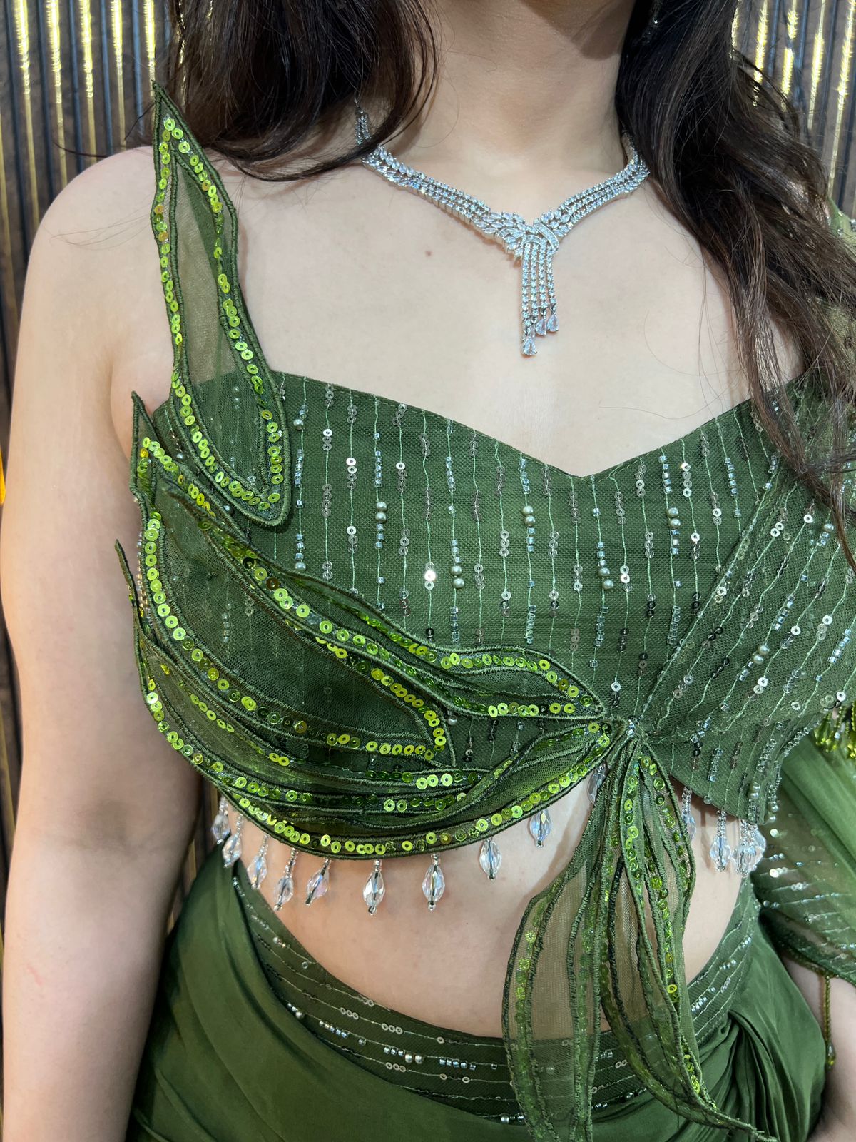 A contemporary fusion ensemble designed for effortless elegance. This Indo-Western set features a delicately embellished blouse with modern draping, paired with a fluid draped skirt that creates a graceful, flattering silhouette. The refined detailing and soft flow of the ensemble bring together festive charm and modern sophistication.