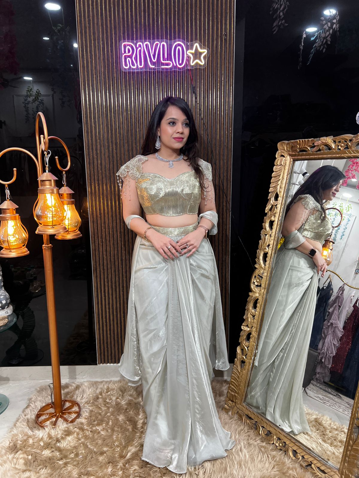 The fluid pre-draped saree in a soft ivory metallic finish creates a sleek silhouette while ensuring comfort and ease of movement. Minimal yet striking, this outfit is ideal for cocktail evenings, engagement functions, reception wear, and luxury festive occasions.