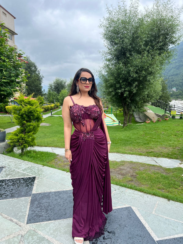 Turn heads wherever you go in this ultra-glamorous plum purple designer saree set. The pre-stitched draped saree is made with rich, flowy fabric that hugs your curves effortlessly, while the corset-style blouse features intricate sequin embroidery and mesh detailing for a bold, fashion-forward look. Ideal for destination weddings, evening parties, or luxury resort events, this look blends elegance with sultry sophistication.